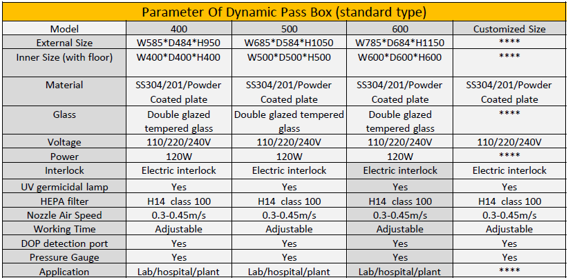 Stainless steel dynamic  pass box in the transfer of goods, the top  blow out a high-speed, clean air, blow the dust particles on the surface of the goods, the interior is equipped with ultraviolet sterilization lamp, can effectively kill the bacteria on the surface of the goods, to be completed when the blow, can open another door to take away the goods. The clean air flow acts as an airlock so that the air outside the clean room does not affect the cleanliness of the room.